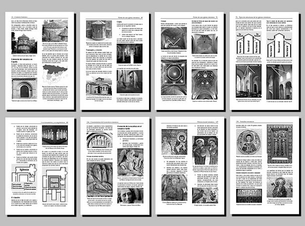 Índice: Preámbulo · Contexto histórico · Nacimiento y evolución del románico · El proyecto de construcción · Elementos básicos de la construcción · Partes de una iglesia románica · Tipos de estructuras de las iglesias románicas · Los monasterios y su arquitectura · Características de la escultura románica · Introducción a la iconografía románica · Pintura mural románica · Tesoro sagrado · Orfebrería románica · Esmaltes románicos · Marfiles (eboraria románica) · Imaginería románica en madera · Pilas bautismales románicas · Otros objetos muebles · Manuscritos iluminados · Glosario e índice general.