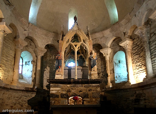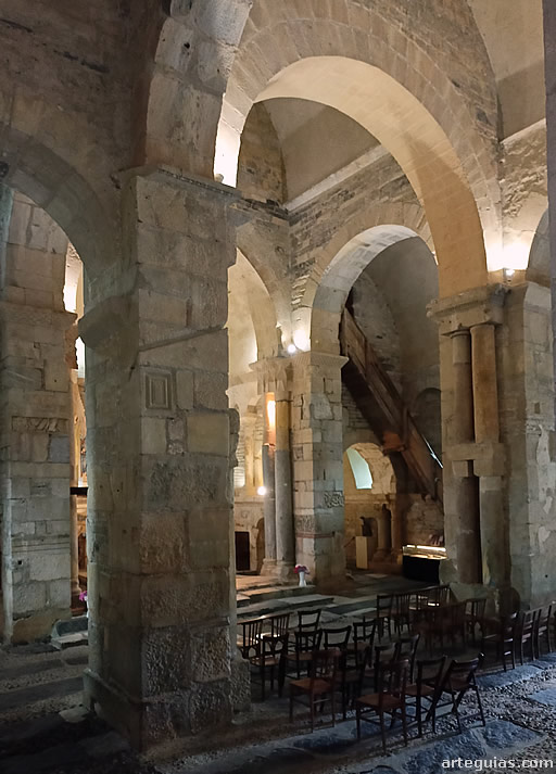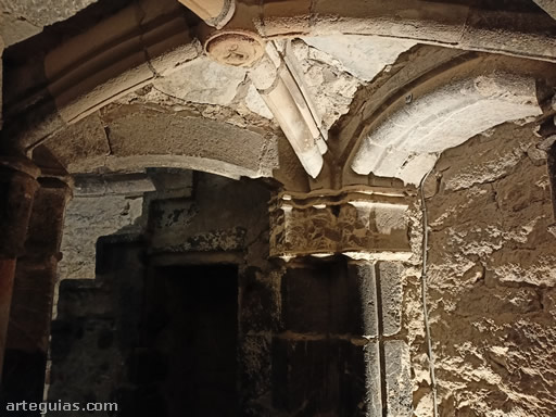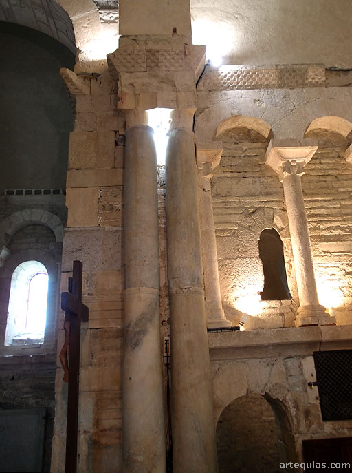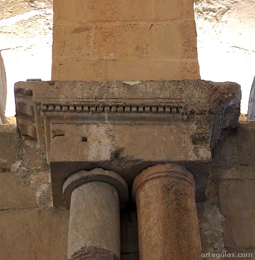con fustes romanos cortos y superpuestos, rematados en capiteles