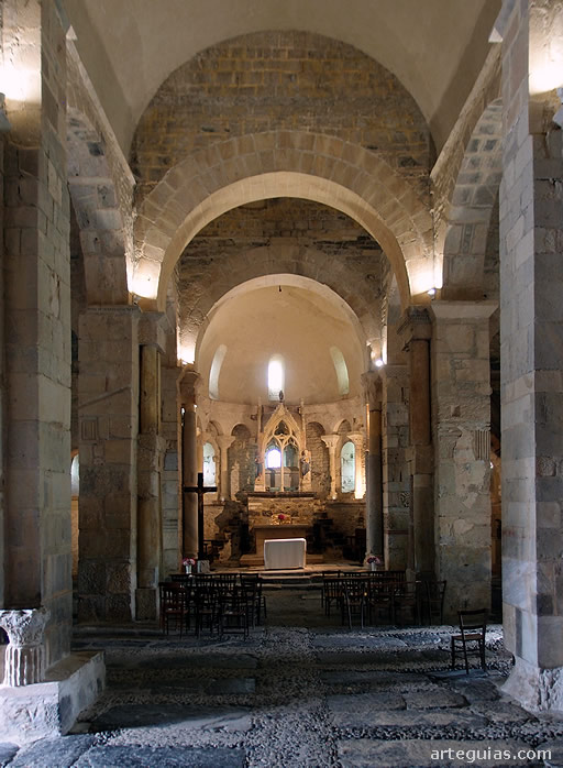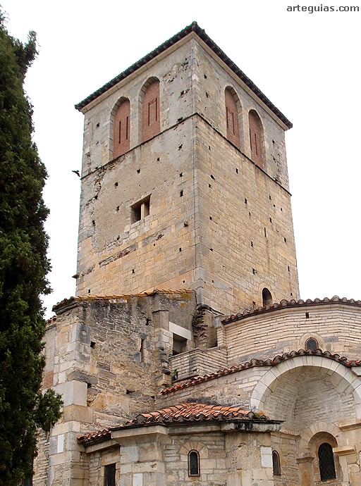 de cuatro tramos, extraña cabecera triabsidal, y torre