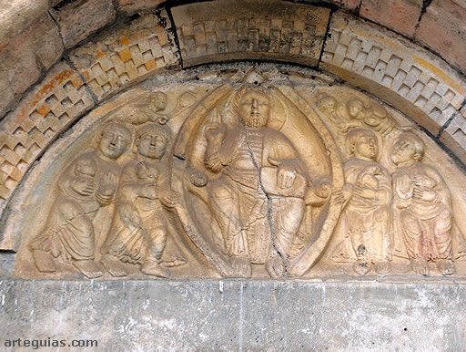 sobre un dintel liso, preside el tímpano la efigie de Cristo