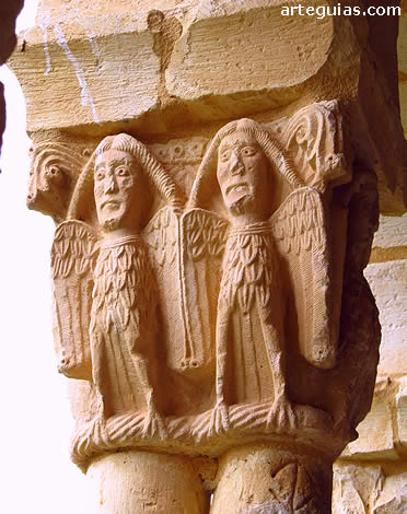 con grandes capiteles de cabezas humanas entre volutas, aves picándose