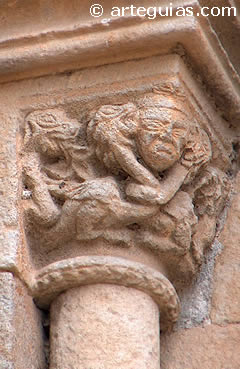 un capitel en el que, entre hojarasca, asoma una curiosa figura
