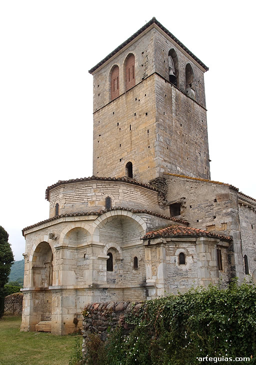 de cuatro tramos, extraña cabecera triabsidal, y torre