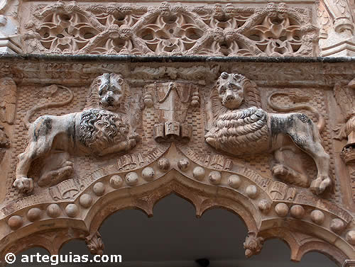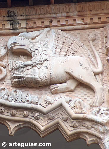 estatuas de grifos y leones en las enjutas de los arcos mixtilíneos.